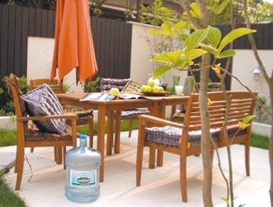 何となく自然に家族が集まれるよう、木製テーブルとイスを庭の中心に据えました。